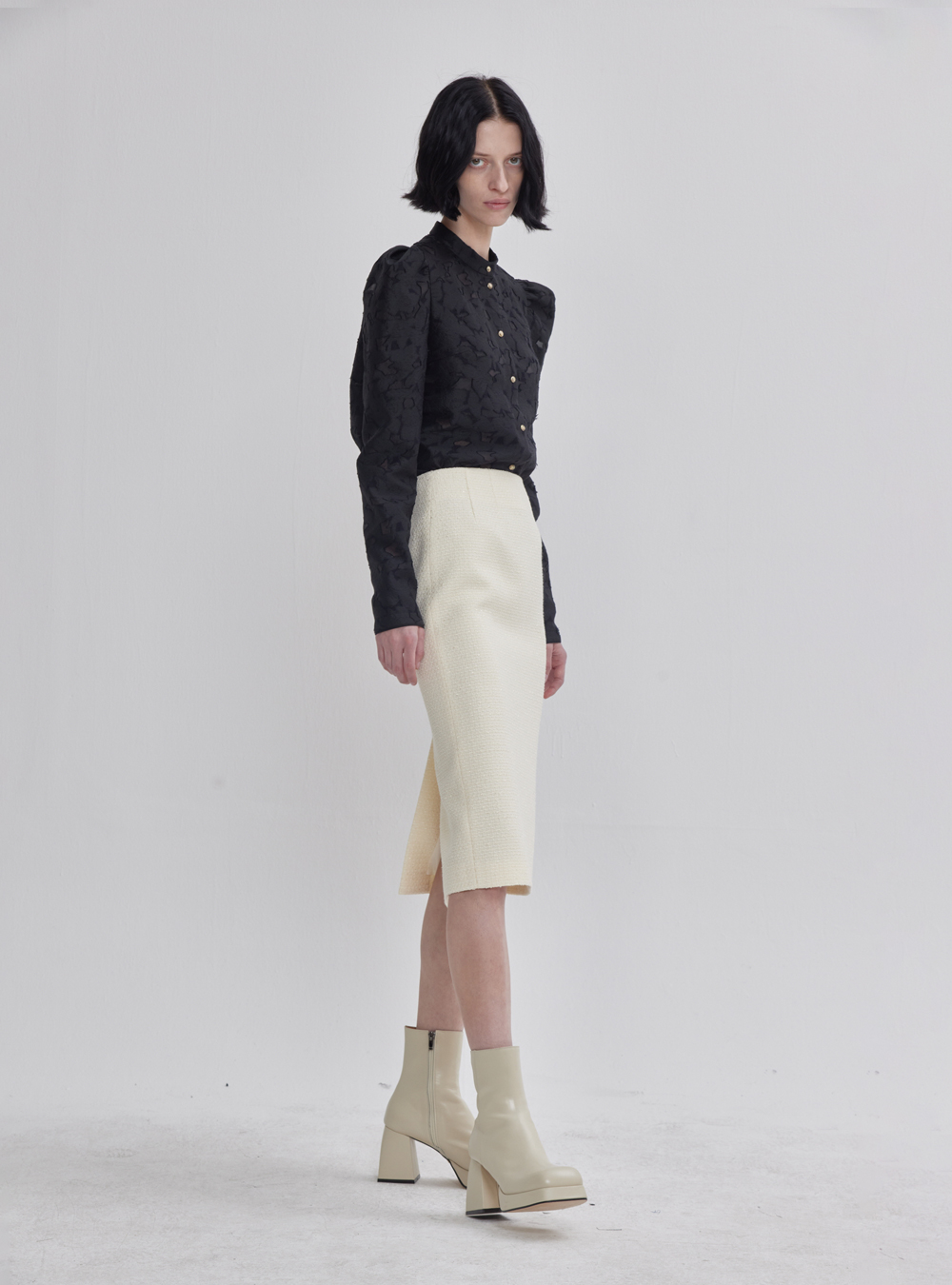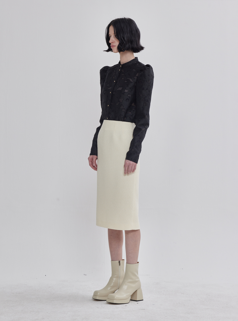 Embrace sophistication with our Tweed Slim-Fit Midi Skirt in Ivory. The tweed fabric adds texture and depth to this elegant skirt, while the slim-fit design flatters your figure. Whether for the office or a formal event, this skirt is a fashion-forward choice.