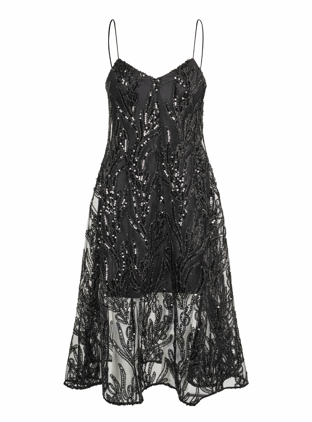 Sequined a-line midi-length sleeveless dress with thin straps. Featuring a tight bodice and a flowing skirt. Intricate beaded floral embroidery in monochrome black. Made out of tulle and inner satin lining.
