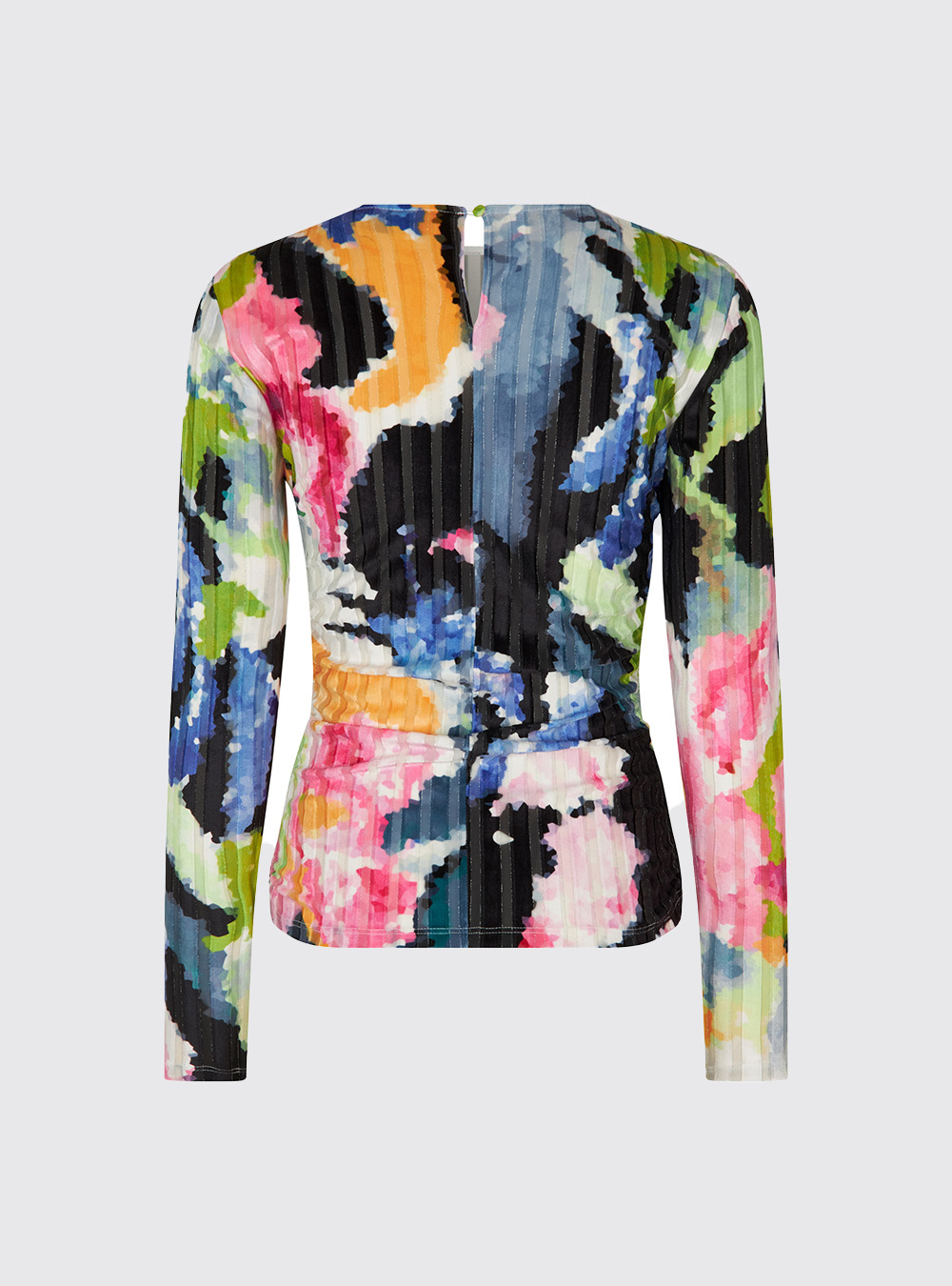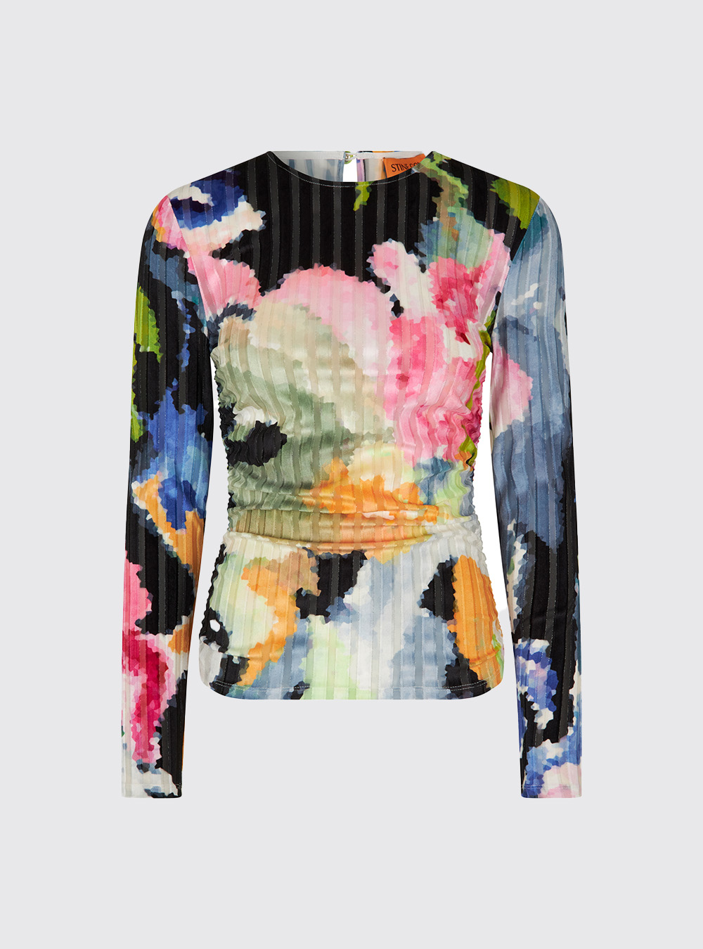 The long-sleeve Stine Goya Vanessa Top features a slim-fitting silhouette and bright all-over floral pattern on a semi-transparent ribbed material.