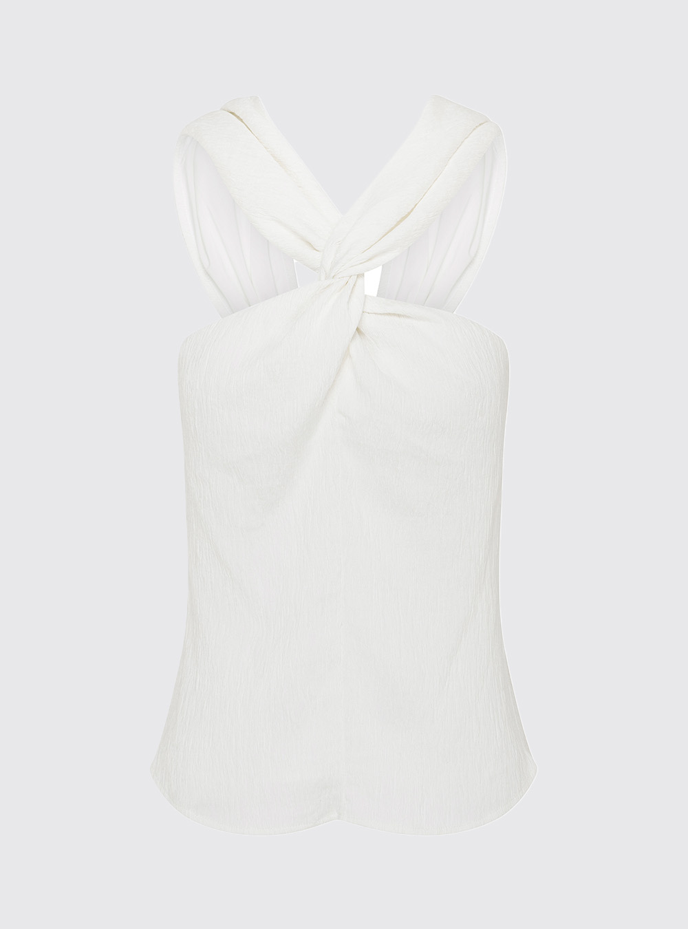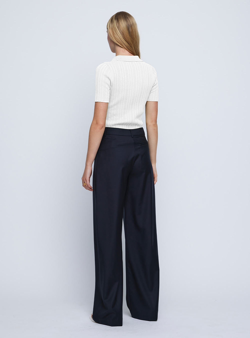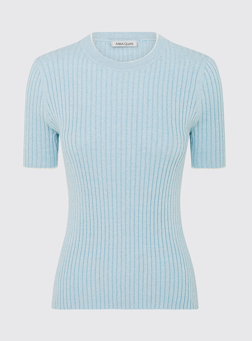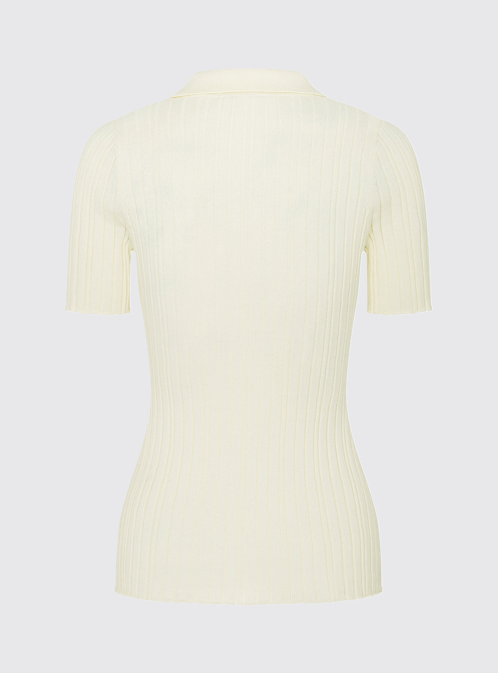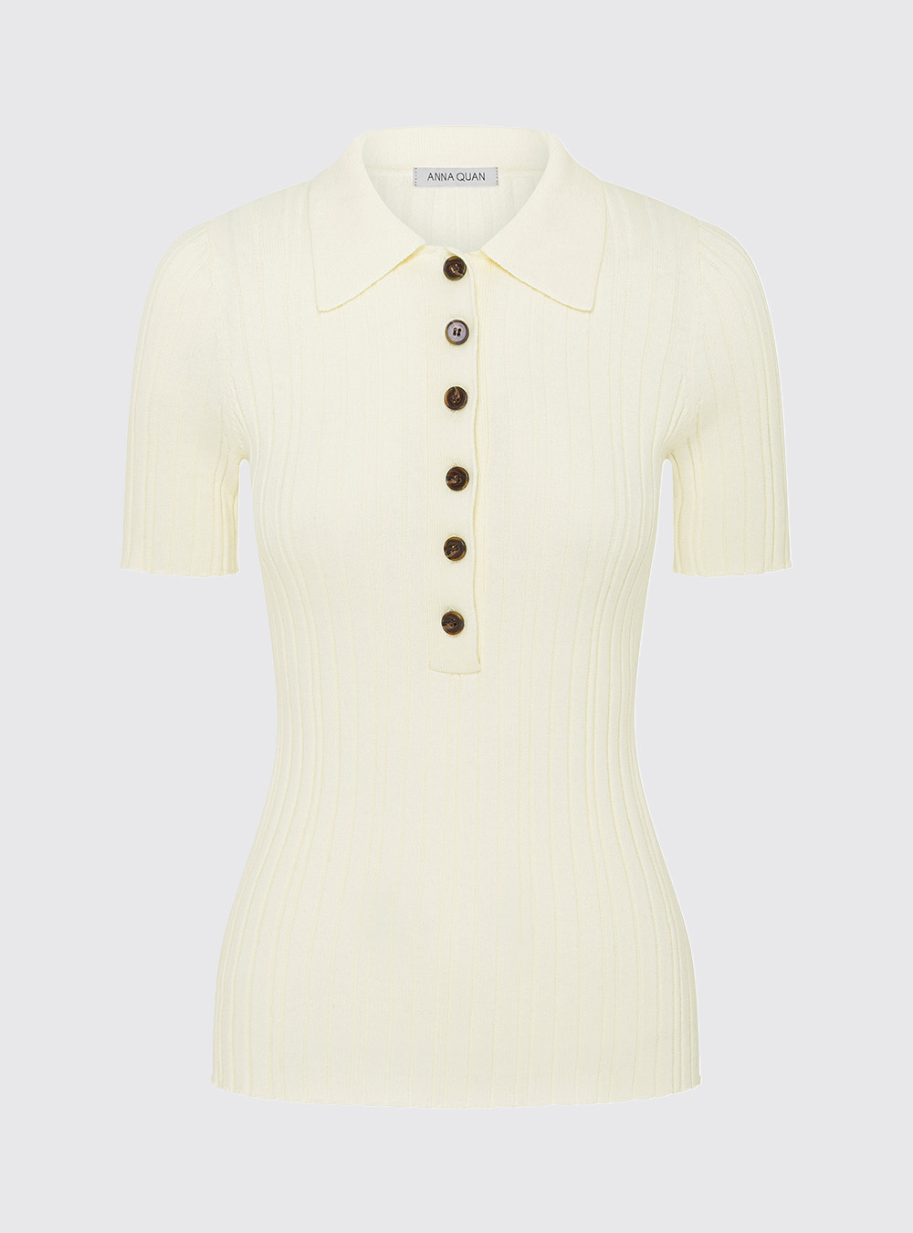 Rib knit cotton short sleeve top with polo neckline and contrast trim. A timeless addition to any wardrobe. This ribbed polo neck top is knitted in a soft 100% cotton. Designed with subtle contrast trimming and a neat button up placket. A piece both singular and universal, you.