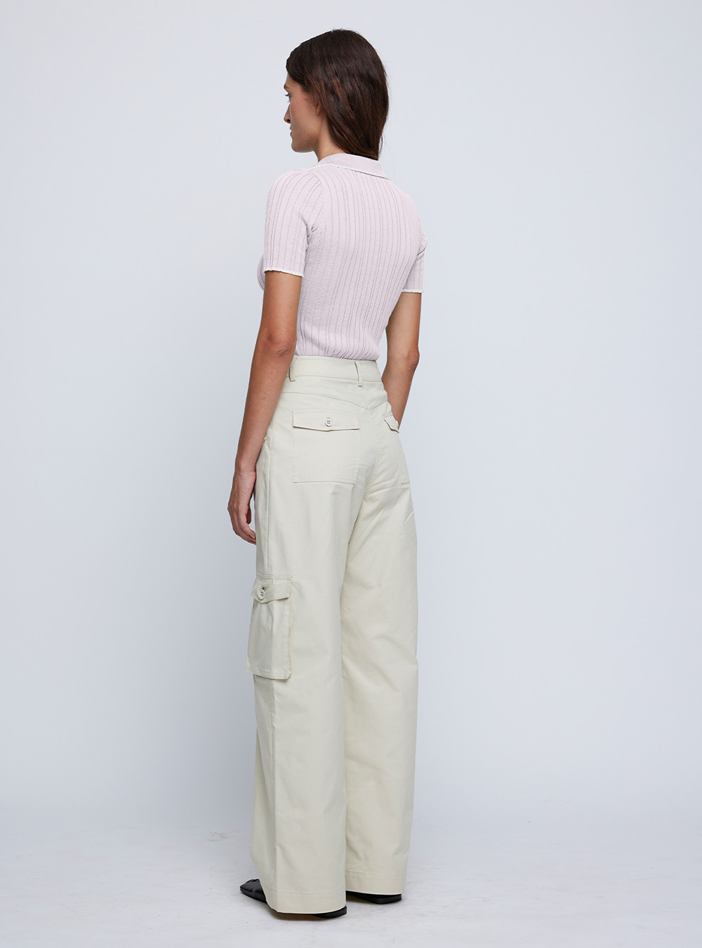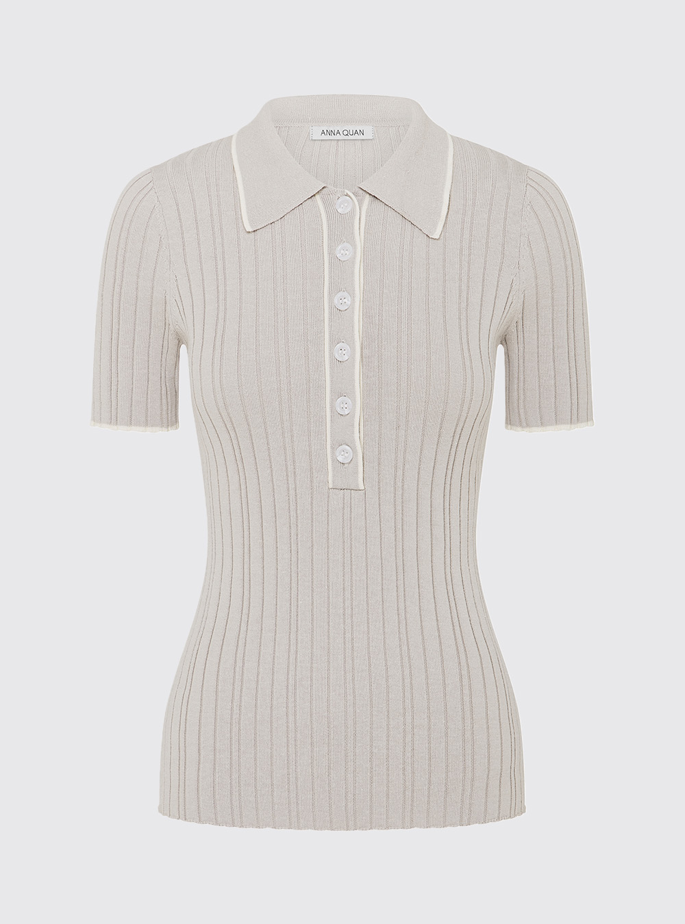 Rib knit cotton short sleeve top with polo neckline and contrast trim. A timeless addition to any wardrobe. This ribbed polo neck top is knitted in a soft 100% cotton. Designed with subtle contrast trimming and a neat button up placket. A piece both singular and universal, you.